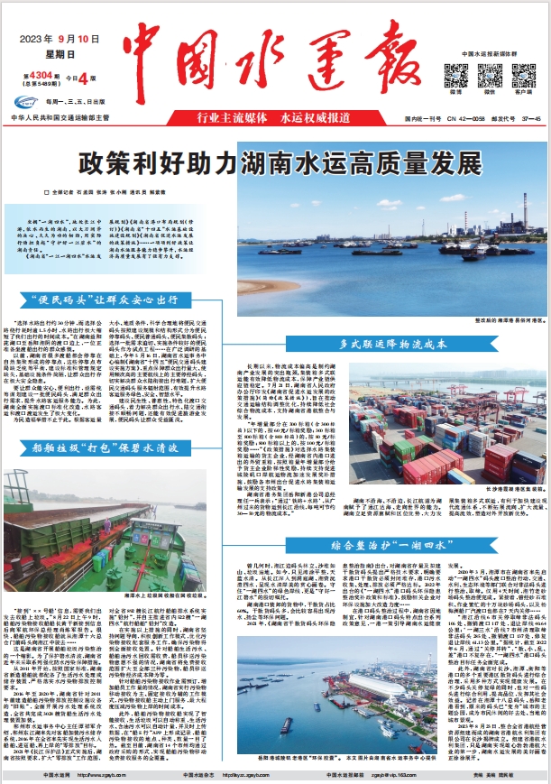 9月10日,中国水运报头版发表题为《政策利好助力湖南水运高质量发展》的文章,长篇报道湖南水运近年来在便民出行、码头整治、污染防治、多式联运等方面的政策支持及发展成效。现予以全文转载分享,全文如下: