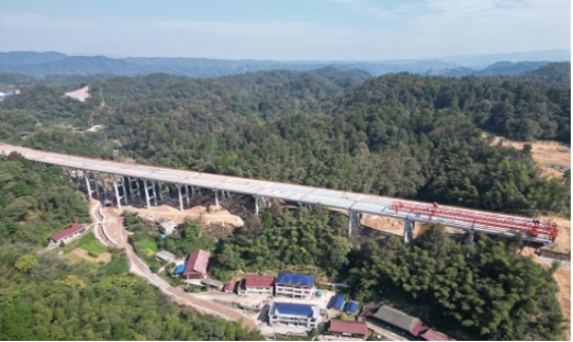 此次贯通的长坪寺大桥全长420米,上部结构采用30米预应力混凝土T梁,共计架设梁板140片。