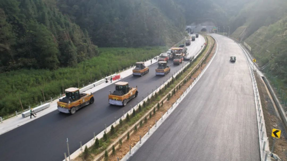 10月24日,官新高速赤水溪隧道左幅出口最后一段沥青上面层摊铺完成,标志着官新高速主线沥青路面施工圆满完成,官新高速建成通车进入最后倒计时。