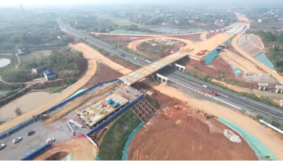 11月18日,项目关键控制性工程之一的射埠互通跨许广高速主线桥左幅钢箱梁顶推顺利完成,标志着醴娄高速全线首座枢纽互通半幅贯通。
