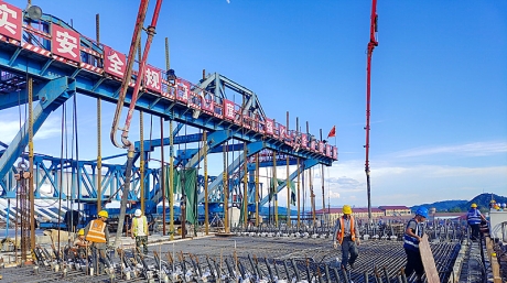 在醴娄高速关键控制性工程之一的株洲湘江特大桥施工现场,两台混凝土泵车发出沉闷的振动声,长长的混凝土输送臂从蓝天白云间垂下,站在如“铁板烧”一样的钢筋垫层上,工人们正在加快首个悬浇梁边跨现浇段的混凝土浇筑。该桥合龙已近在咫尺。